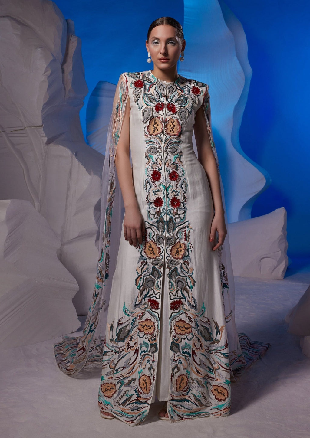 Ivory cotton silk front-open jacket with a back cape, intricately enhanced with detailed and colorful silk thread and Zardozi embroidery.