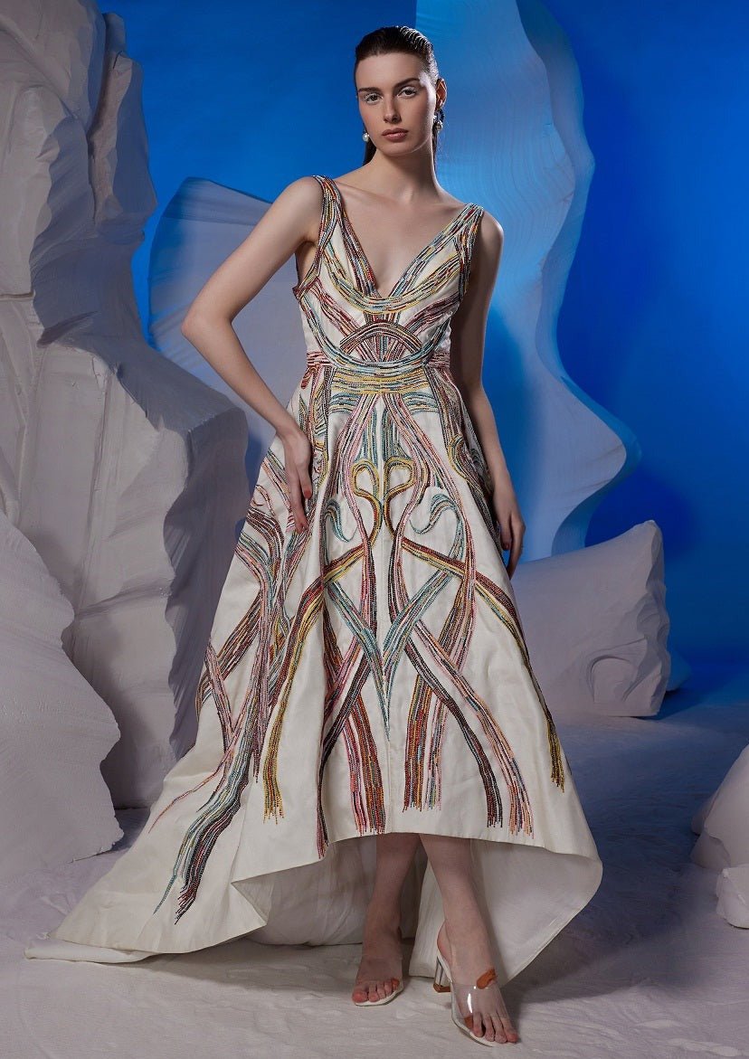 Ivory cowl dress adorned with vibrant embroidery at the waist, effortlessly combining modern flair with colorful detailing.