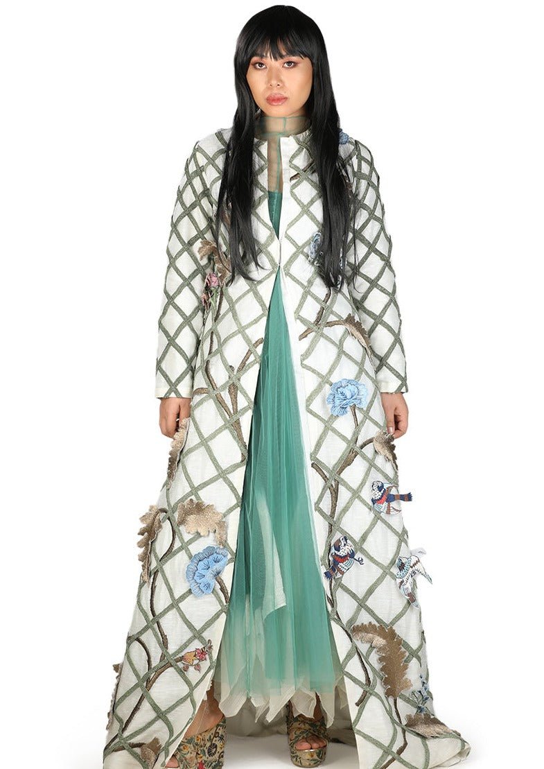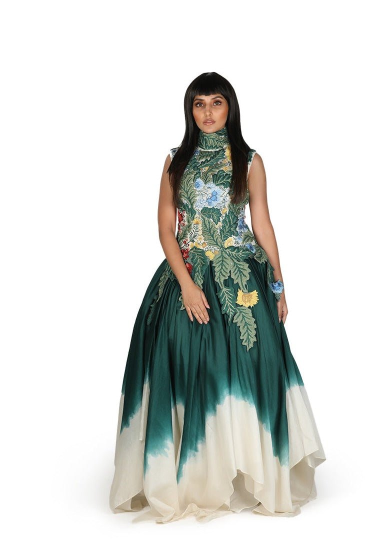 Green and Ivory high low gown in cotton silk with a high neckline fit & embroidered 3-D applique work on the top.