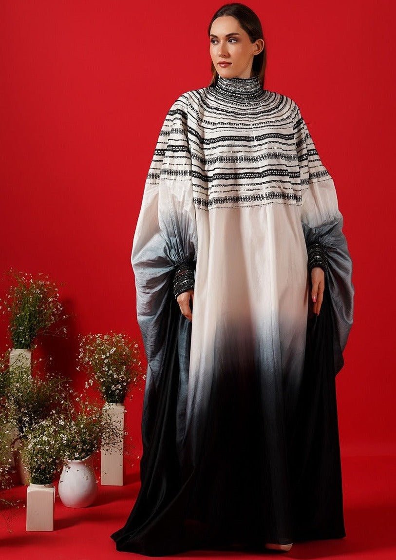 Cotton silk kaftan in ombre of white and black with a high neckline, surfaced with intricate embroidery.
