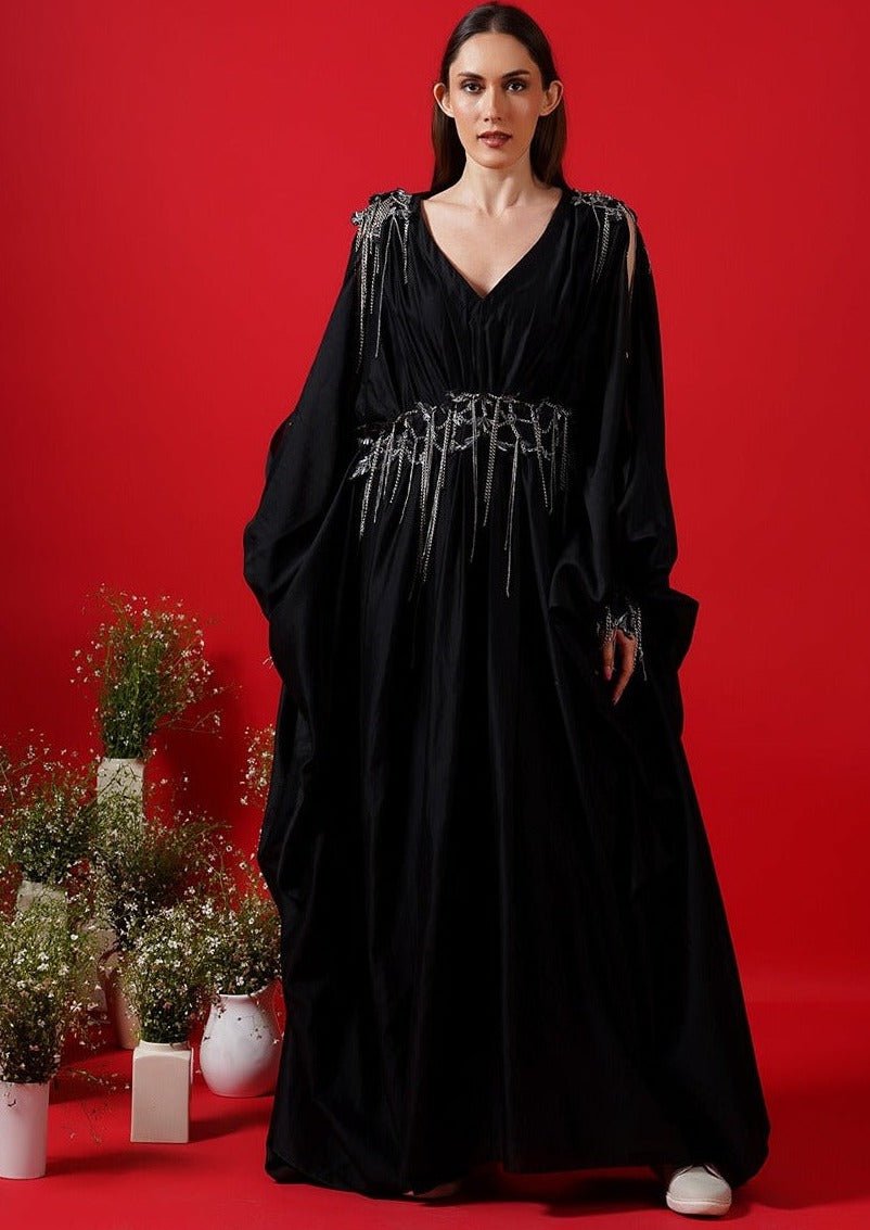 Black cotton silk kaftan with a v-neckline and embroidered shoulders and belt