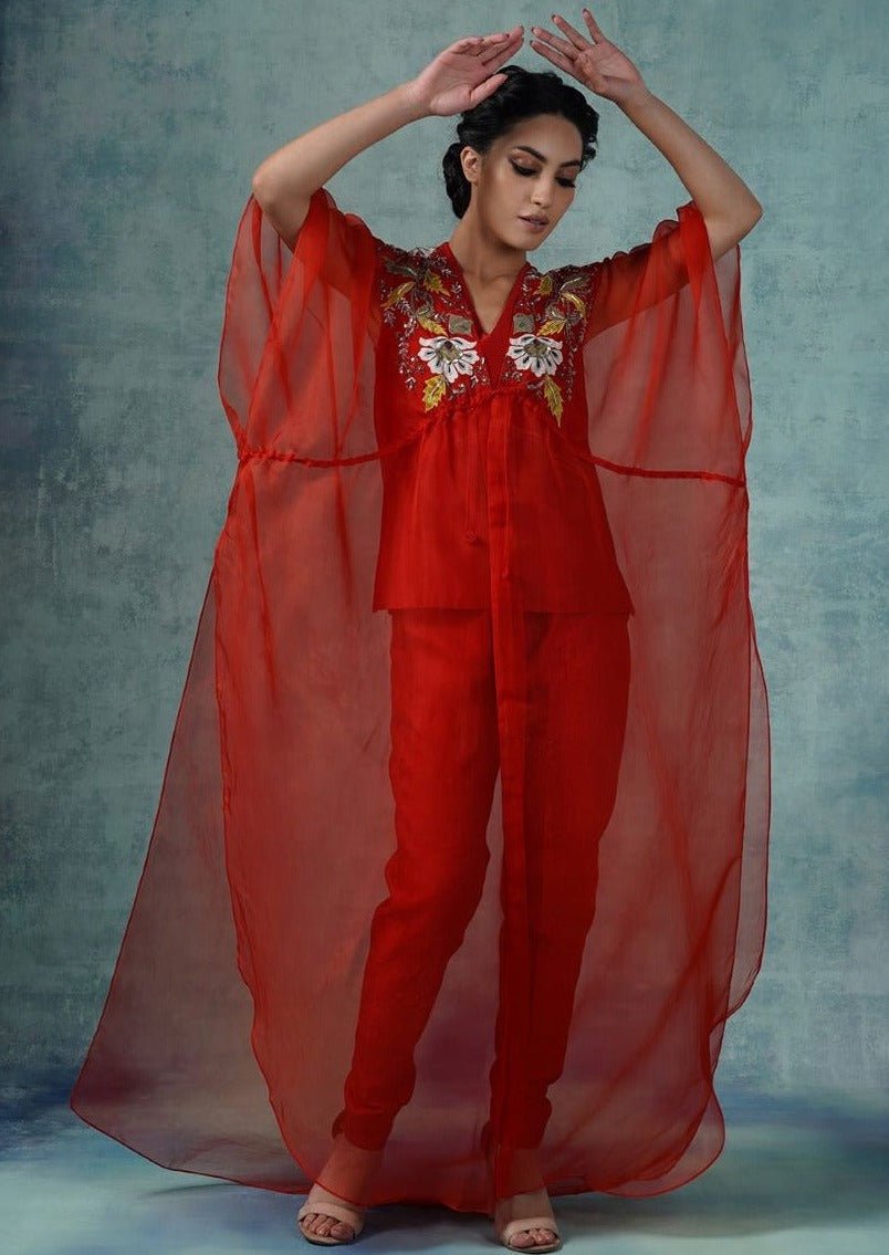 A red cotton silk top and pant topped with an organza floor-length kaftaan that is embroidered around the neck and has a knot arrangement around the waist.
