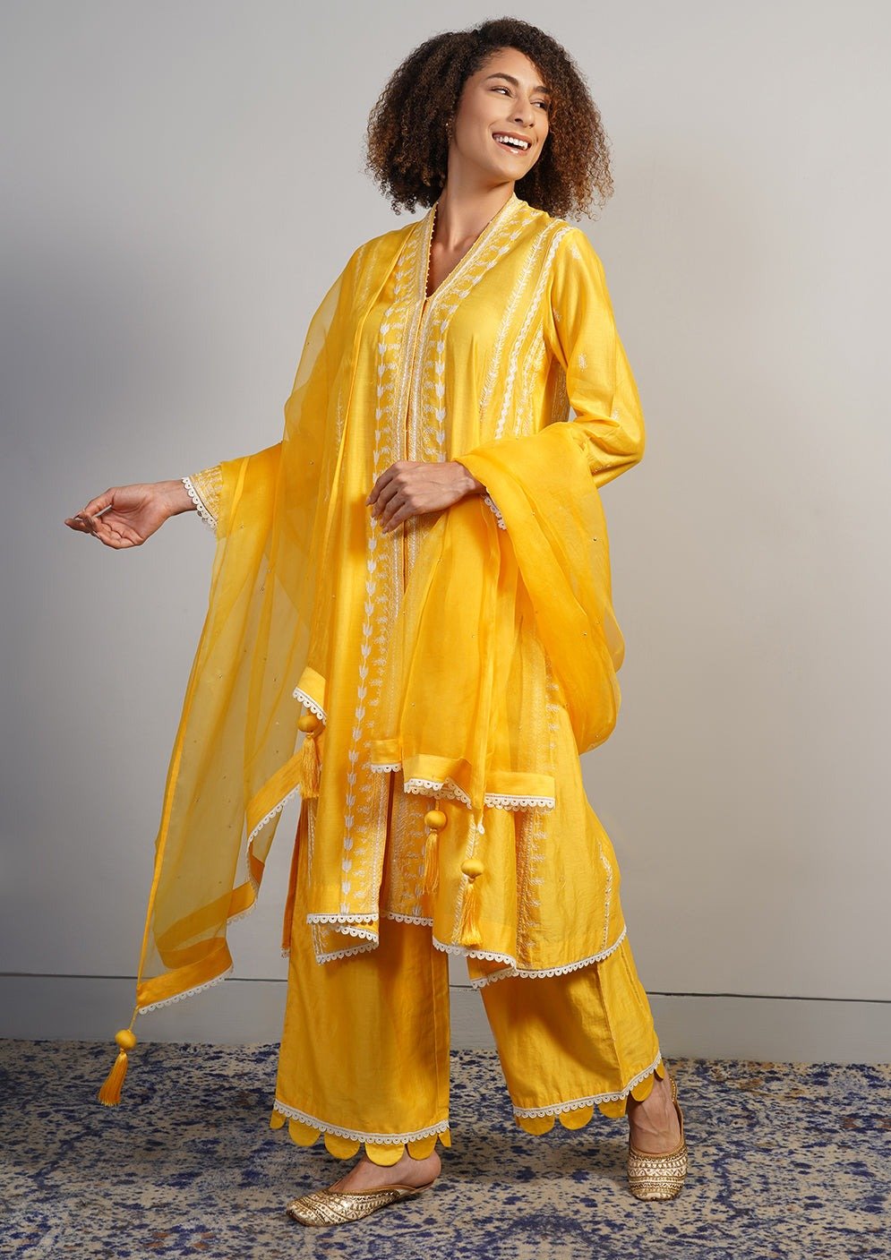 A beautiful V-neck, front open (secured with hooks) sunshine yellow cotton silk suit set adorned with intricate Aari embroidery in white silk yarn along with an organza Dupatta that has a lacy border and Lankans. The scalloped ...