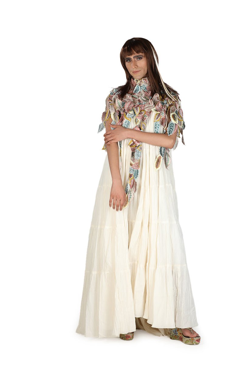 Ivory floor-length cotton tier dress with a splurging high neckline with beautiful 3-D Applique work on the neck and shoulders that dissipates downwards.Color: IvoryFabric: Cotton SilkCare Instructions: Dry Clean Only