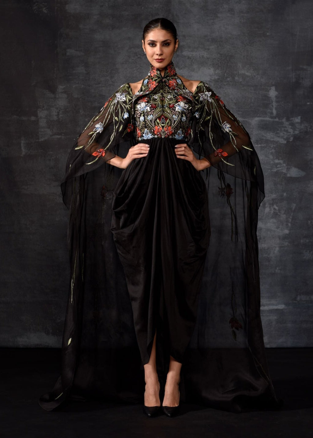 Command attention in this dramatic black ensemble, featuring an intricately embroidered bodice, sheer cape sleeves, and a draped silhouette—perfect for evening galas and high-fashion events.
