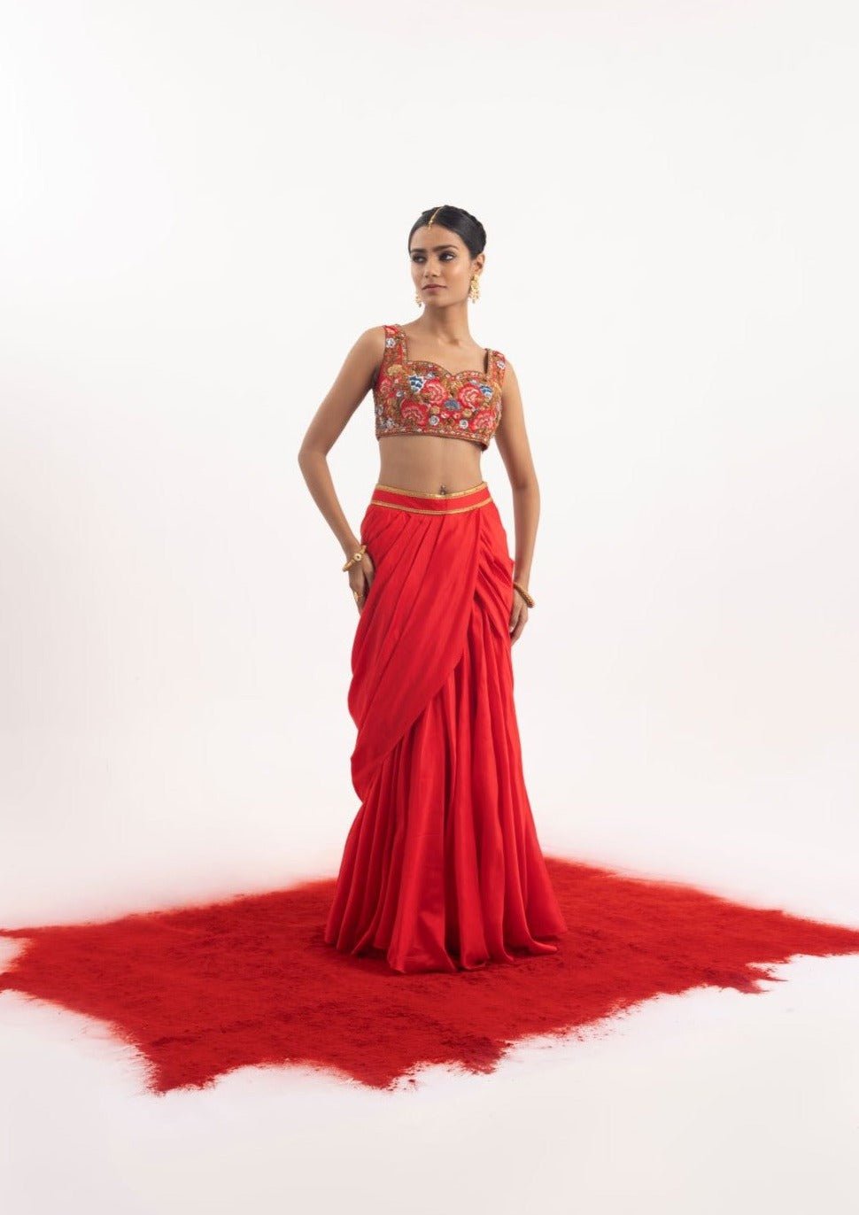 Elegant 2-piece set featuring a red cotton silk draped skirt paired with an embroidered choli, creating a sophisticated ensemble with a touch of glamour.