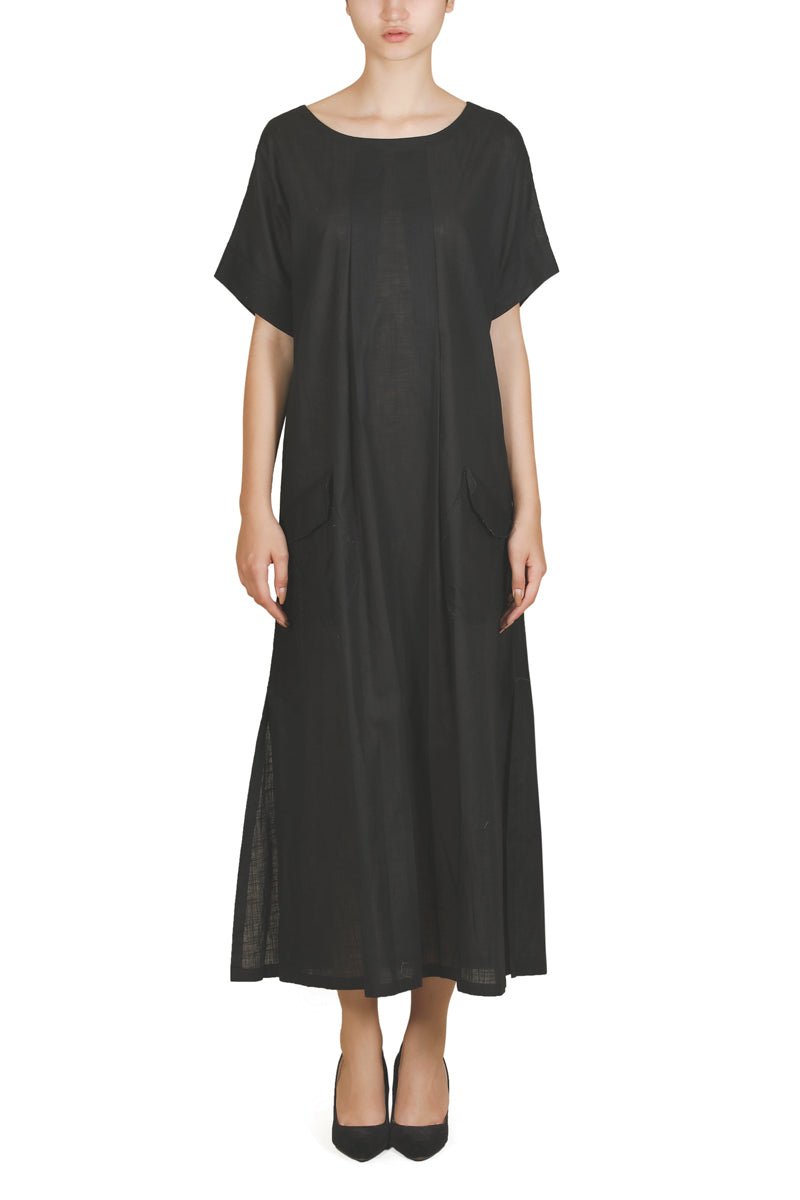 Featuring a Black double inverted pleats Dress with flap pockets & side-slit detailing.Color: BlackFabric: Linen CottonCare Instructions: Dry Clean Only.