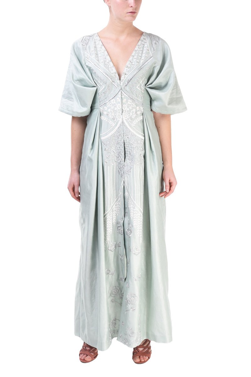 Ice Blue front-opening collar attached embroidered trail chanderi & organza dress.Color: Ice BlueFabric: Chanderi & OrganzaCare Instructions: Dry Clean Only.
