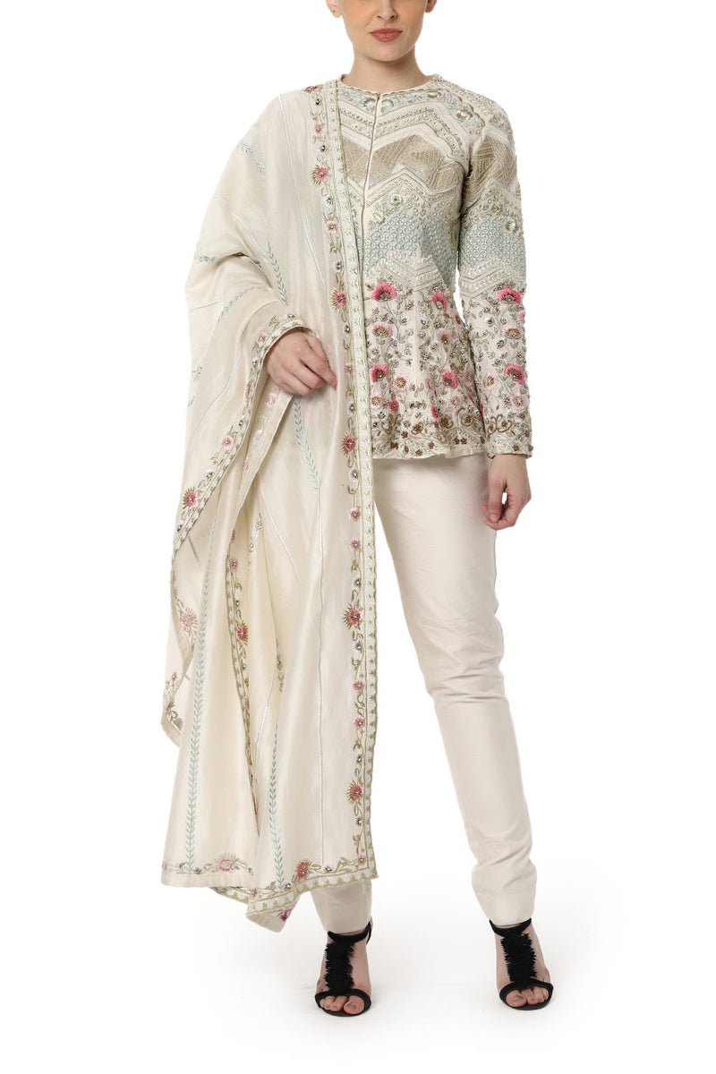 Off white rib chanderi silk embroidered peplum top with pants and chanderi silk dupatta