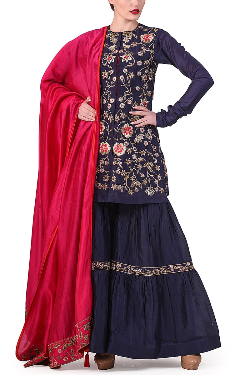 Ivory front-opening embroidered short Kurta & sharara paired with an embroidered magenta dupatta. Color: NavyFabric: Cotton SilkCare Instructions: Dry Clean Only.