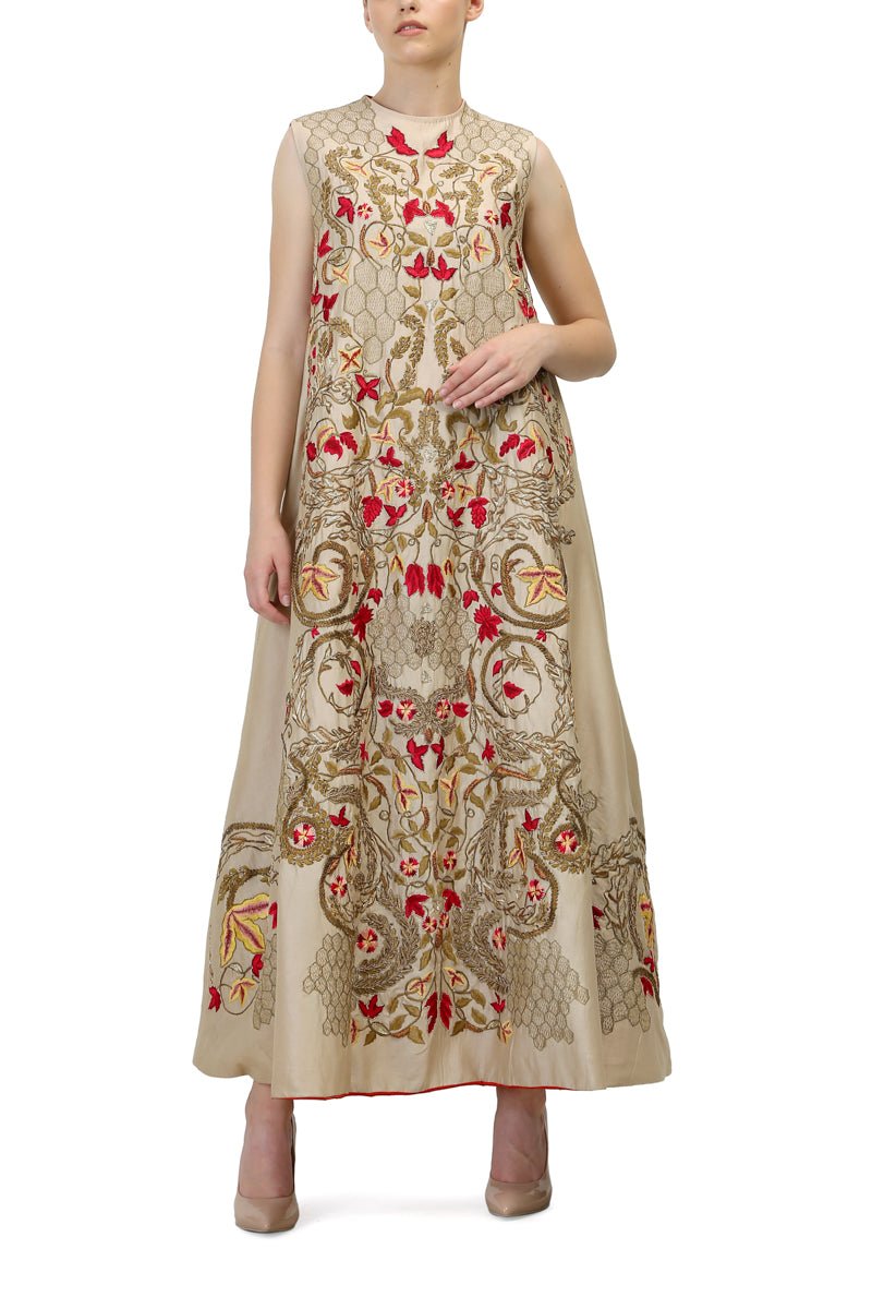 Beige panelled front zipper opening jacket Gown, embroidered in colourful silk yarn & zari work.