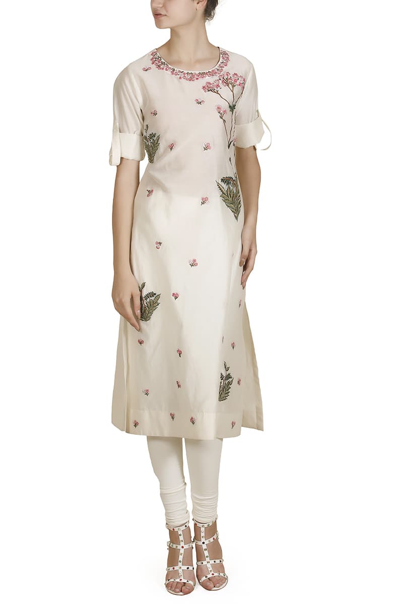 Ivory straight cut Cotton Silk Kurta with silk yarn embroidery of floral motifs.