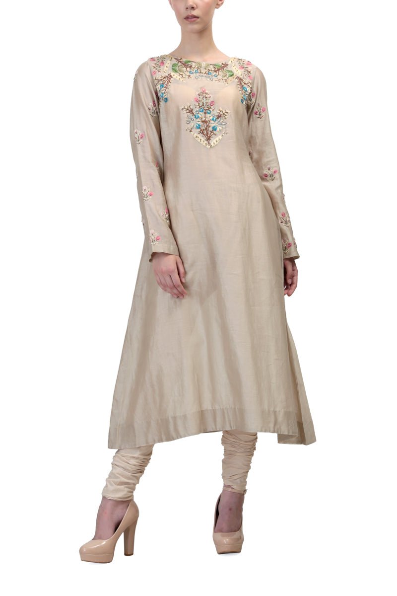 Featuring a beige embroidered cotton silk long kurta.Color: BeigeFabric: Cotton SilkCare Instructions: Dry Clean Only.