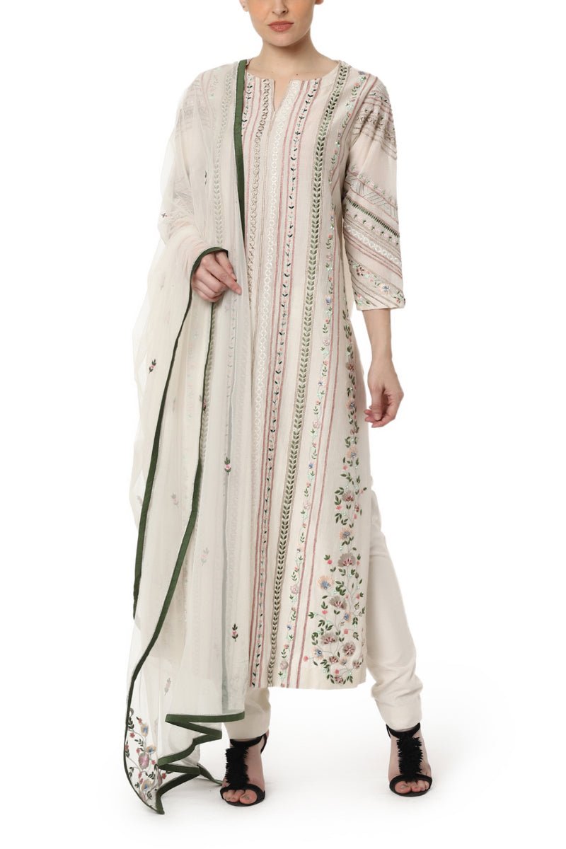 Ivory rib chanderi silk embroidered kurta with embroidered net dupatta