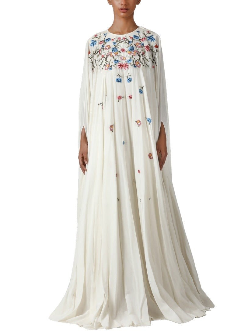 Ivory floor-length cotton silk kaftan with colorful silk yarn embroidery.Color: IvoryFabric: Cotton SilkCare Instructions: Dry Clean Only