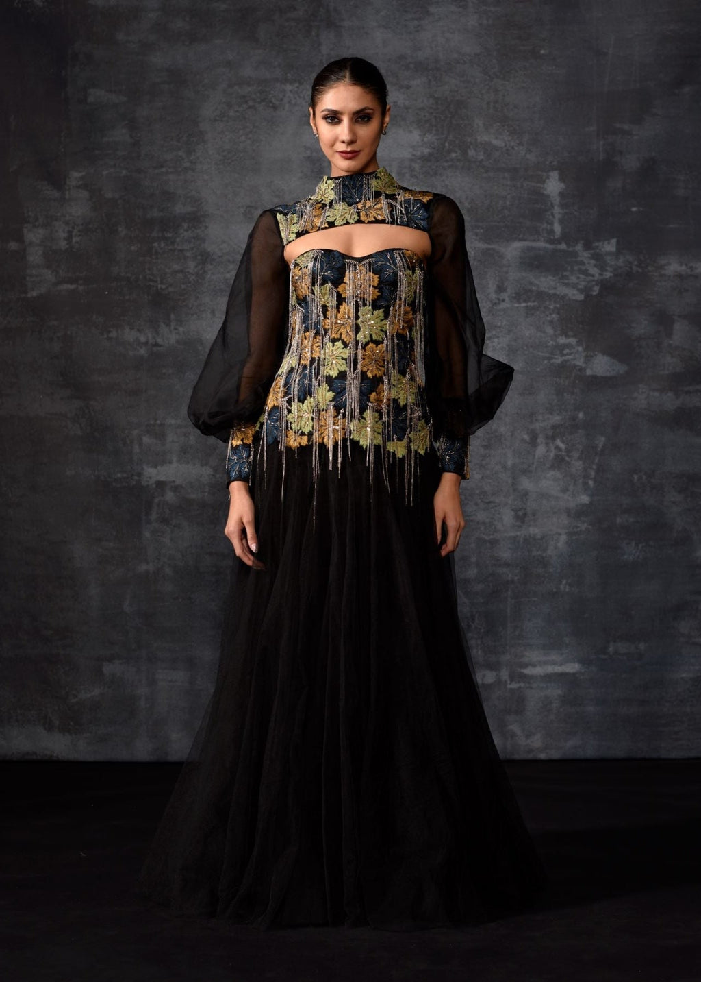 This elegant black floor-length anarkali-style dress features full sleeves and a round neckline, offering a classic silhouette. The bodice is richly embroidered with an intricate tapestry of florals and foliage in vibrant shade...
