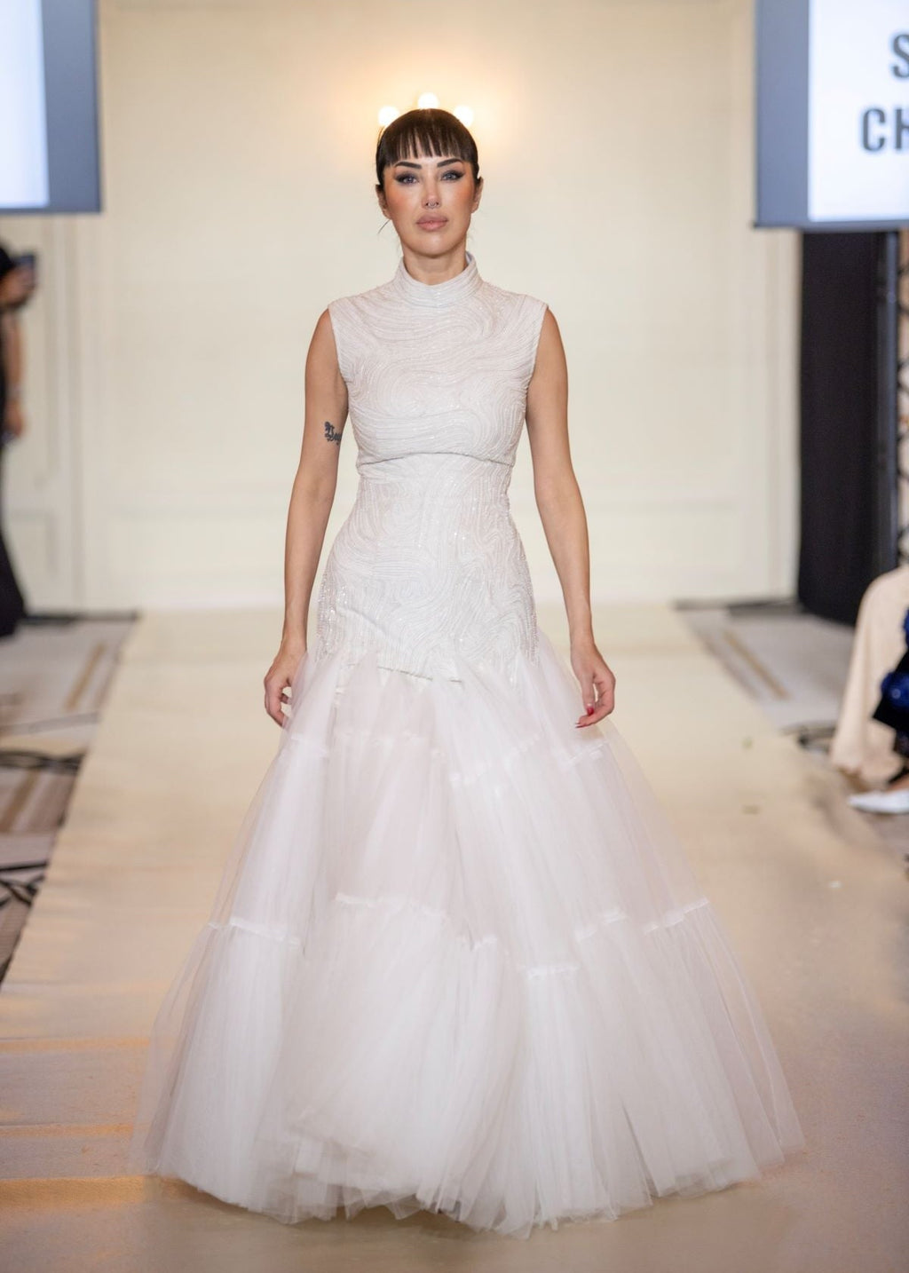 This elegant sleeveless gown features a high neckline and a fitted, intricately textured bodice that flows into a voluminous layered tulle skirt. Perfect for evening events or bridal occasions