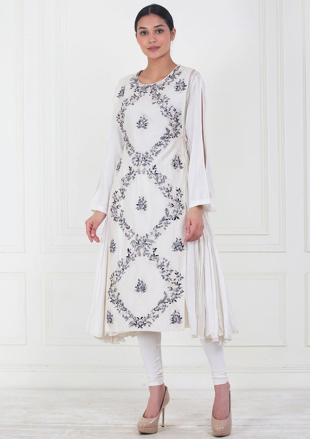 A cotton anarkali kurta with embroidered cotton silk panel in the front and back that is tied with a knot.