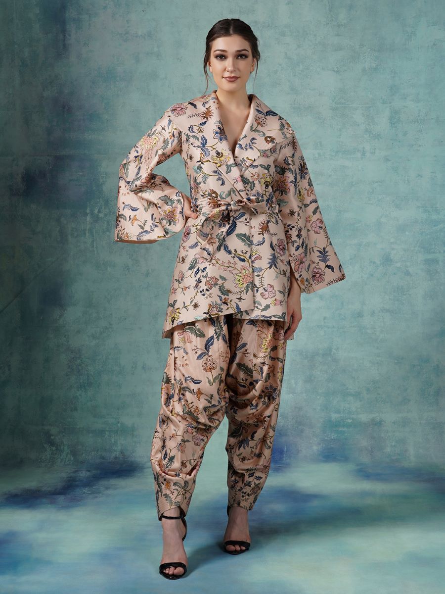 Featured here is dhoti style pants coordinated with wide sleeves, broad collared jacket in peach cotton silk base that is surfaced with digital prints and Dabka hand embroidery.