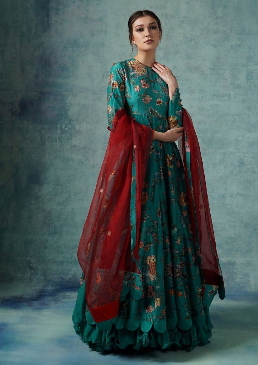A green cotton silk Anarkali scalloped at the hem with digital print and dabka handwork that has a red organza Dupatta which is scalloped at the borders. The Anarkali has a voluminous cotton lining inside .