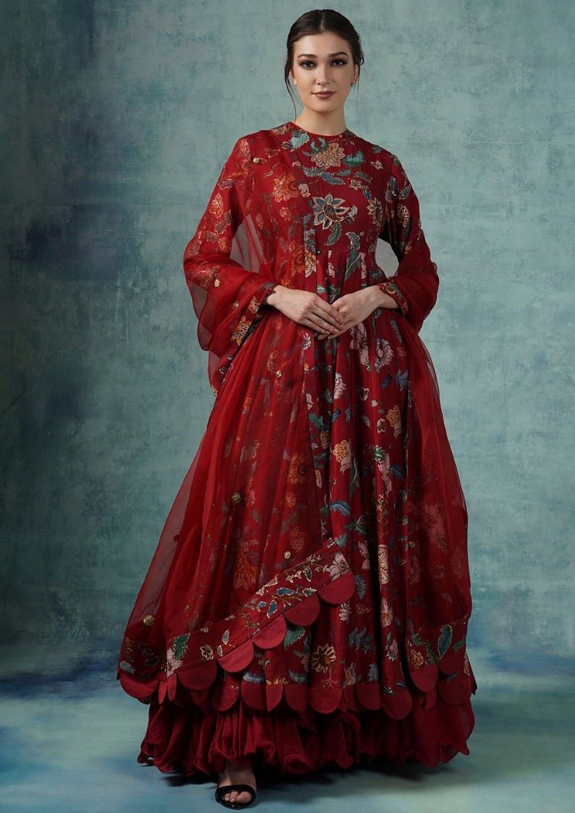 A red cotton silk Anarkali surfaced with digital prints and dabka hand work. It comes with a voluminous cotton lining inside and a matching organza Dupatta which is scalloped at the borders.