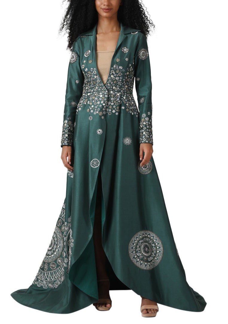 A green cotton silk high-low, collared jacket with a plunging neckline. The gown is adorned with zardosi work and a trail at the back . Color: Green Fabric: Cotton Silk Care Instructions: Dry Clean Only
