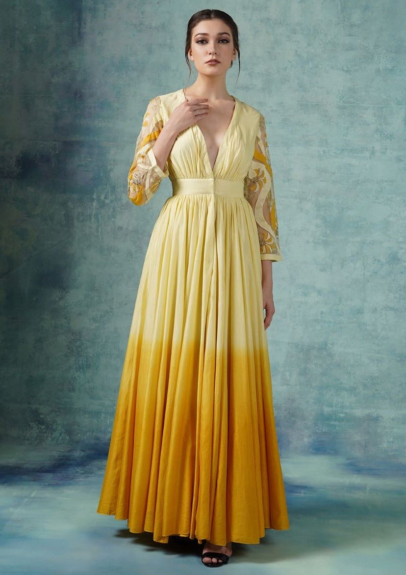A yellow ombré gown in cotton silk with deep V-neck line and beautiful organza sleeves surfaced with patch work. The waist is given definition with