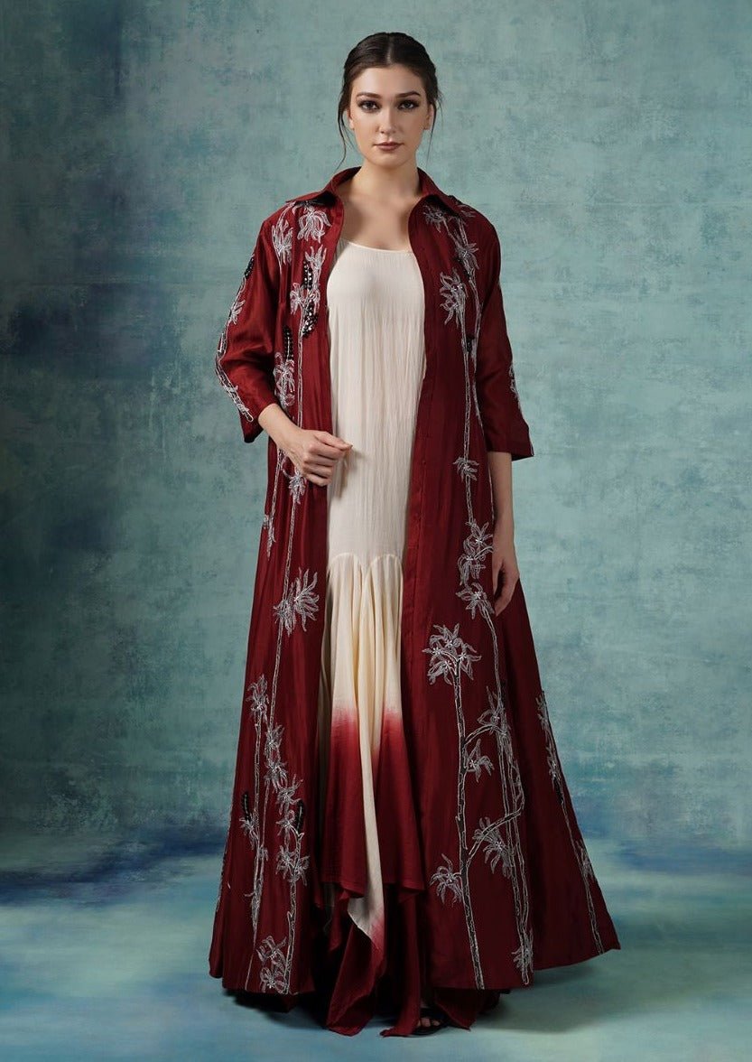 An ombré dyed cotton asymmetric dress is topped with a cotton silk floor length jacket that is embroidered in silk yarns and bead work.