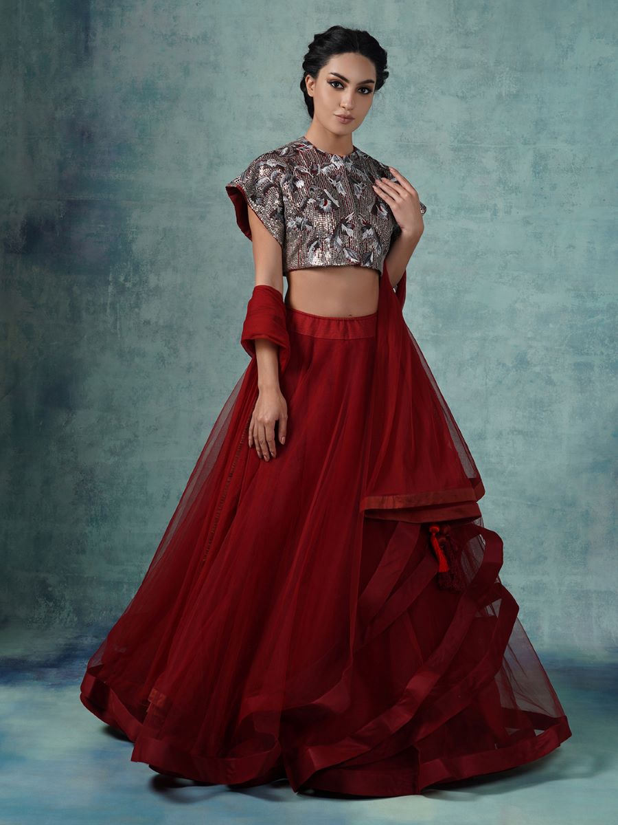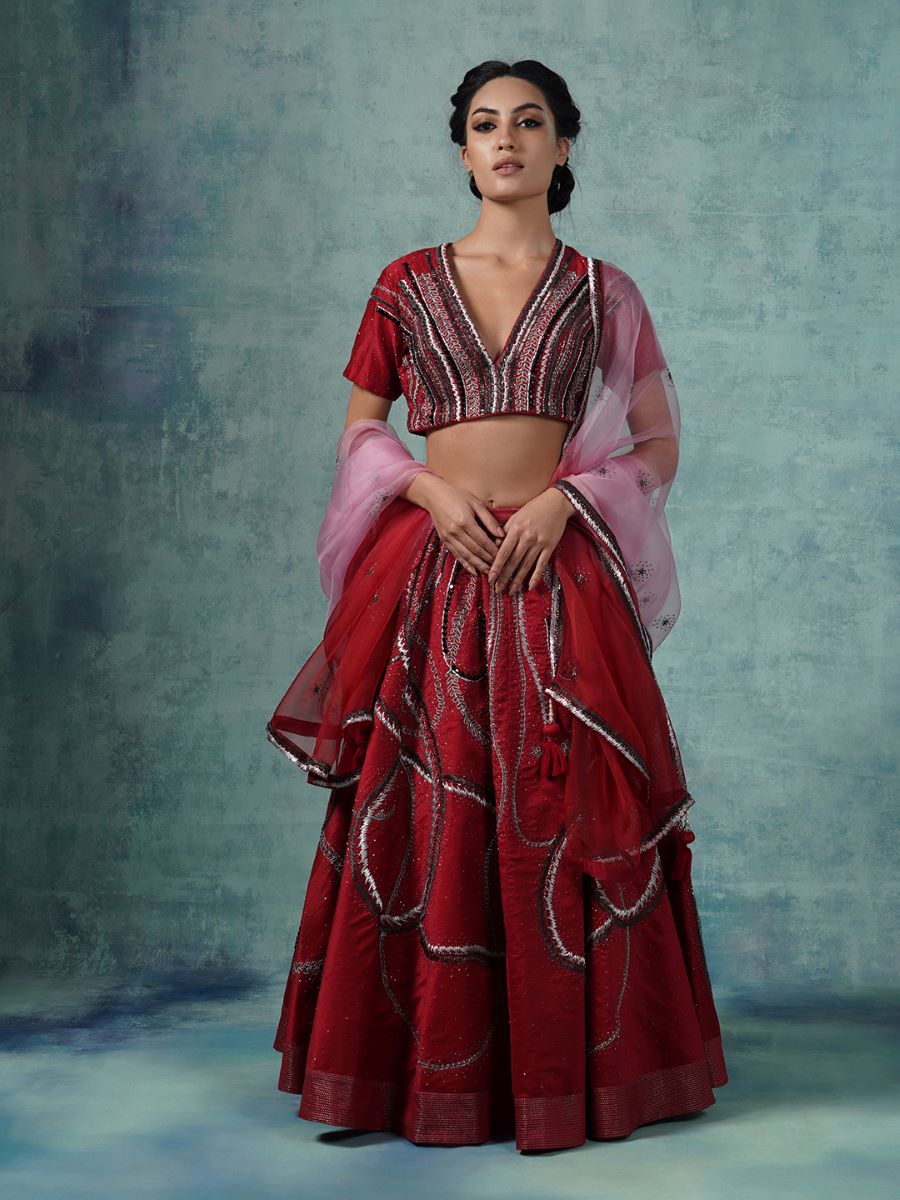 A cotton silk lehenga in that is intricately embroidered in silk yarns and bead work. An ombré shaded organza Dupatta with hand made tassels completes the look.