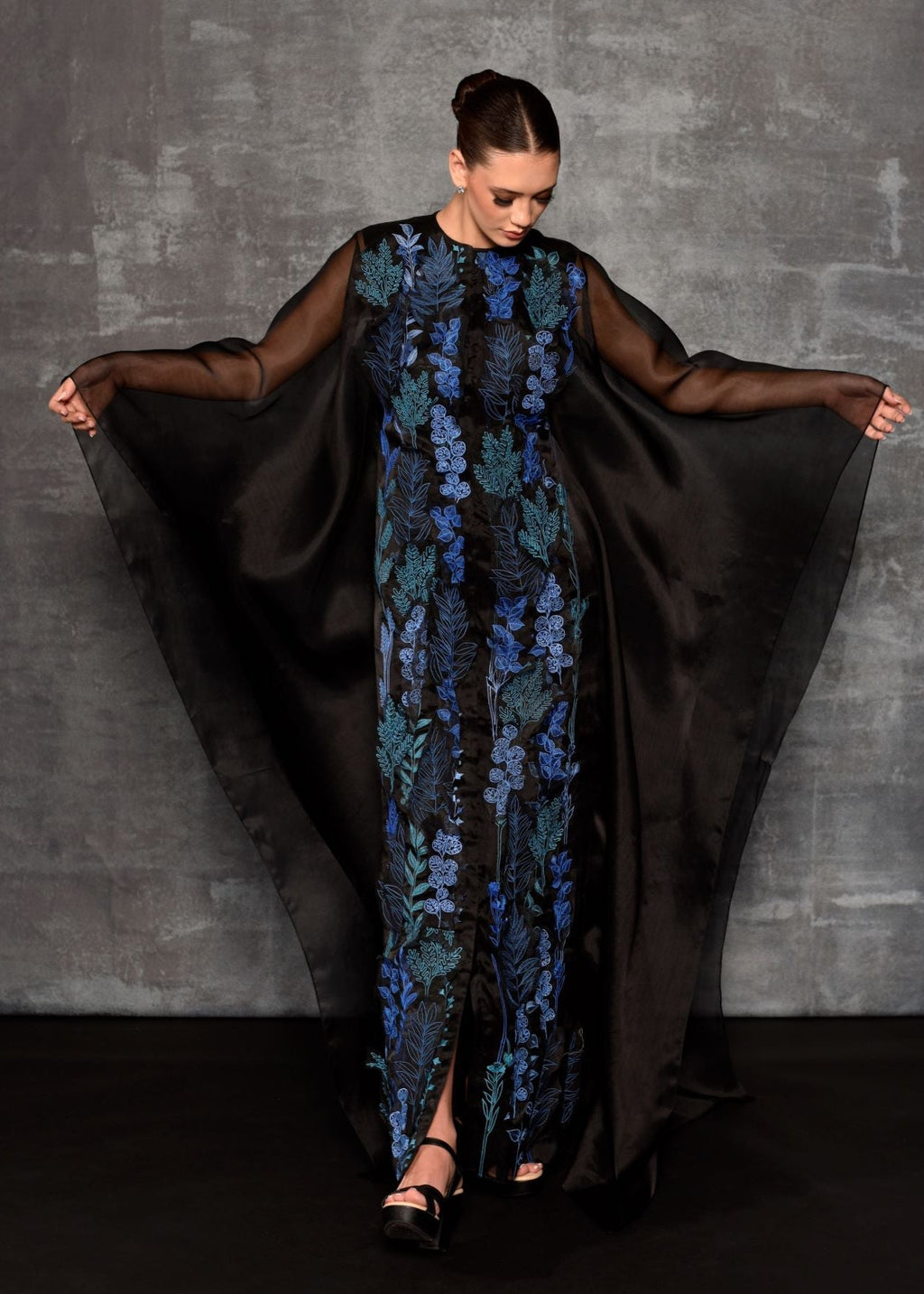 This exquisite formal dress features a striking silhouette with a full-length, flowing black cape that drapes elegantly from the shoulders