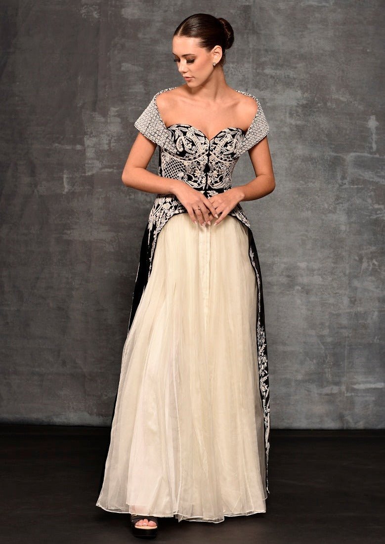 Black bustier front opening asymmetric hemline embroidered gown.Color: BlackFabric: Velvet & OrganzaCare Instructions: Dry Clean Only.