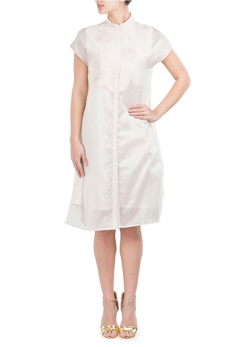 Ivory front opening knee-length Cotton Silk shirt Dress with burnt effect detailing at the yoke.