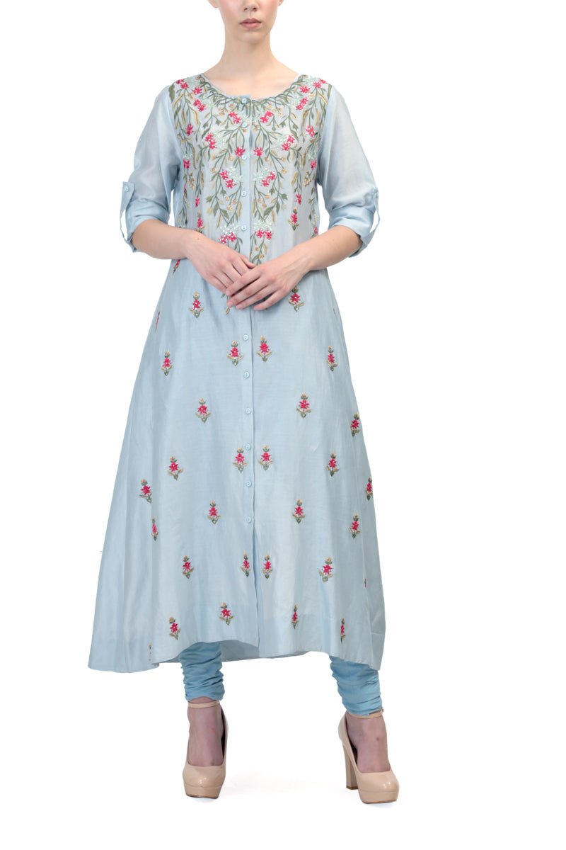 Featuring a powder blue front button placket straight kurta embroidered in floral motifs of silk yarn & sequins. Color: Powder BlueFabric: Cotton SilkCare Instructions: Dry Clean Only.