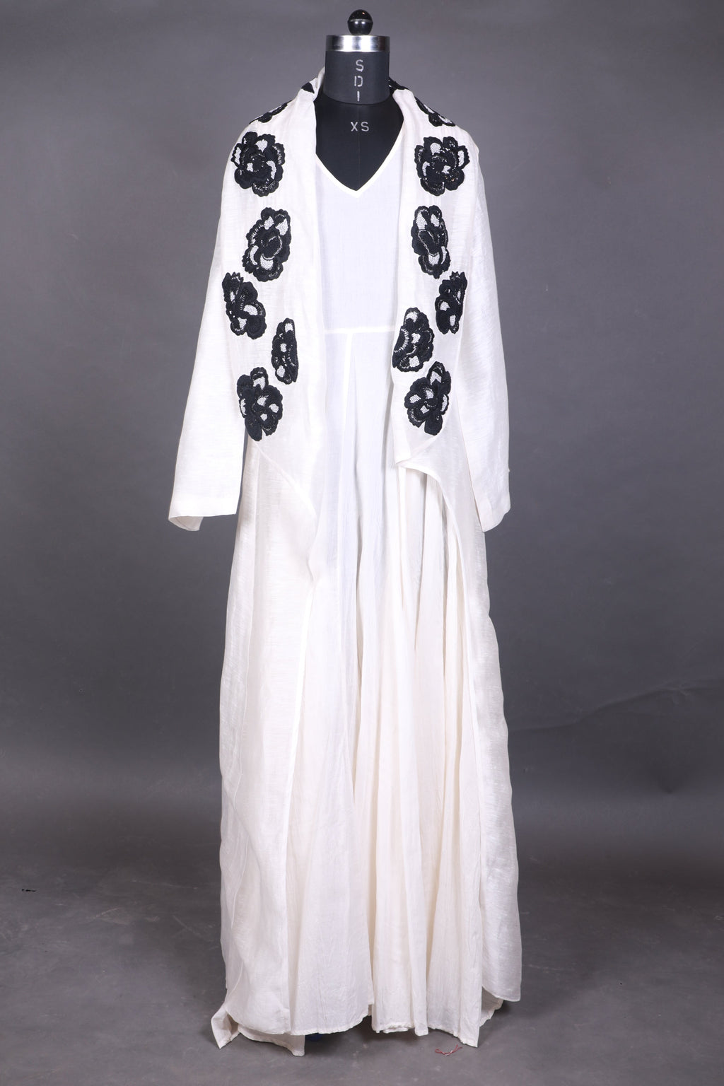 An A-line, knee-length dress made in cotton silk. The skirt is sewed in a way to add texture and showcases a gradient of black to white in layers. The top of the dress is beautifully embroidered in silver zari.