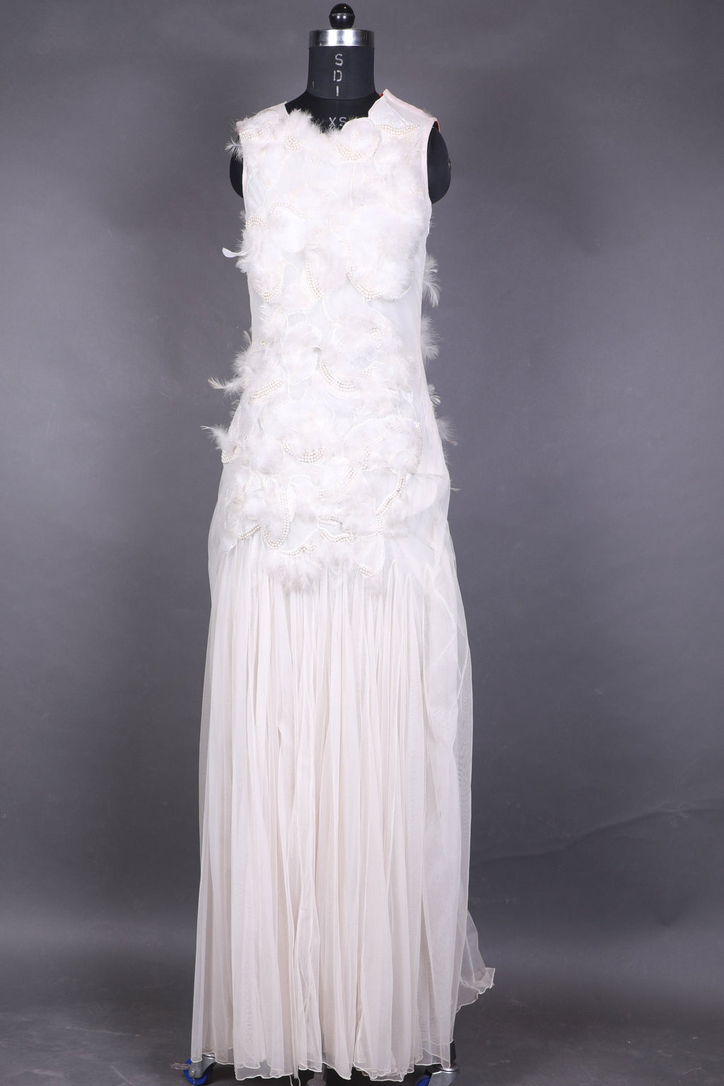 Design: A graceful long dress crafted in soft white crepe, offering an elegant drape and a refined, minimal silhouette perfect for contemporary occasion wear.
