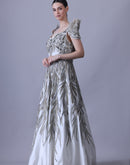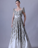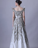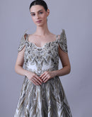 This elegant gown features an off-shoulder design with structured sleeves and intricate metallic embroidery. The bodice showcases a floral motif