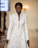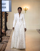 Make a bold statement in this regal full-sleeve gown featuring structured shoulders and intricate floral embroidery. The high collar and floor-length silhouette blend traditional elegance