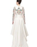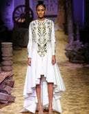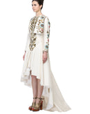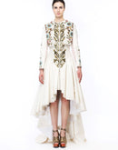 Ivory jacket style cotton silk dress that has an openable front and is embellished in silk & zari yarn.