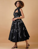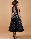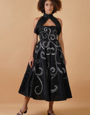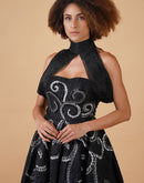 Featured here is a black chanderi A-line dress with a tube top pattern and box pleats on the skirt, showcasing beautiful silver zari embroidery. Adding fun to the garment is a stylised cape that makes for the neck and sleeves.