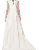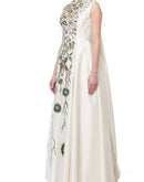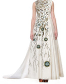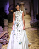 Ivory floor-length fit & flare attached trail style Cotton Silk Gown embellished in silk yarn & zari embroidery.