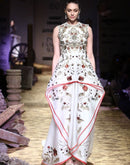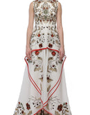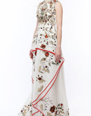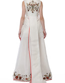 Ivory front-opening fit & flare peplum style organza silk gown highlighted with red taping & embroidered floral motifs of silk & zari yarn.