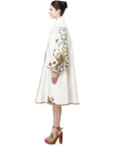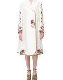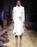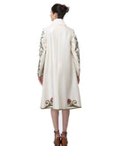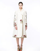 Ivory overlap collared front opening jacket style knee-length cotton silk dress embroidered floral motifs of silk & zari yarn.