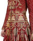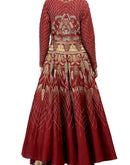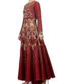 Red front-opening fit & flare cotton silk gown embroidered in zari yarn.
