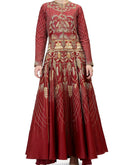 Red front-opening fit & flare cotton silk gown embroidered in zari yarn.Color: RedFabric: Cotton SilkCare Instructions: Dry Clean Only.