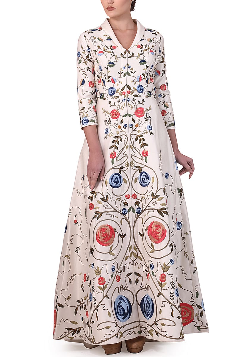 Ivory fit & flare shifted centre front collared Cotton Silk Gown embroidered floral motifs of silk & zari yarn.