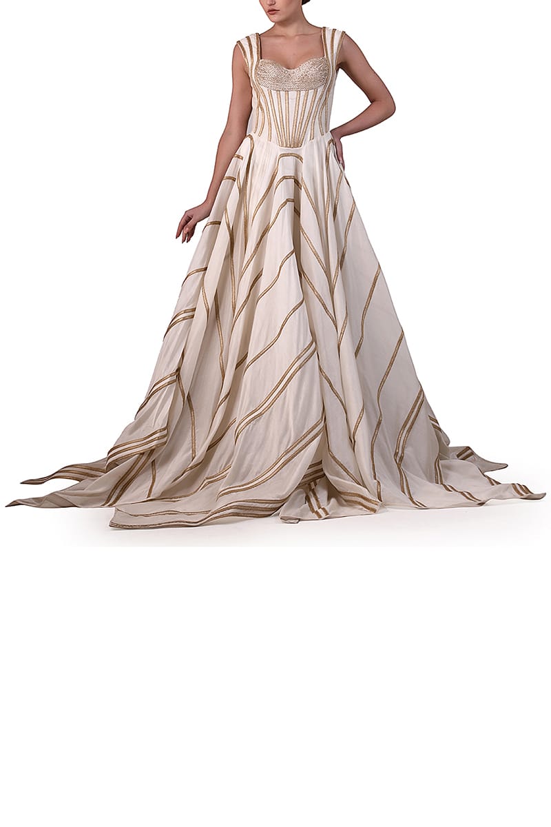 Ivory sweetheart neckline fit & flare Cotton Silk corset Gown embroidered in golden zari work.
