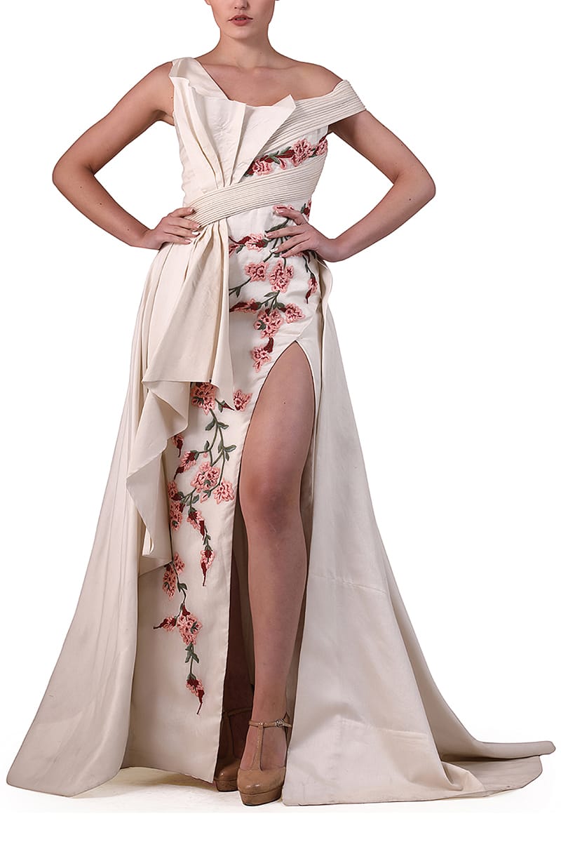 Ivory front slit off-shoulder textured Cotton Silk Gown embroidered floral motifs of silk yarn & zari.