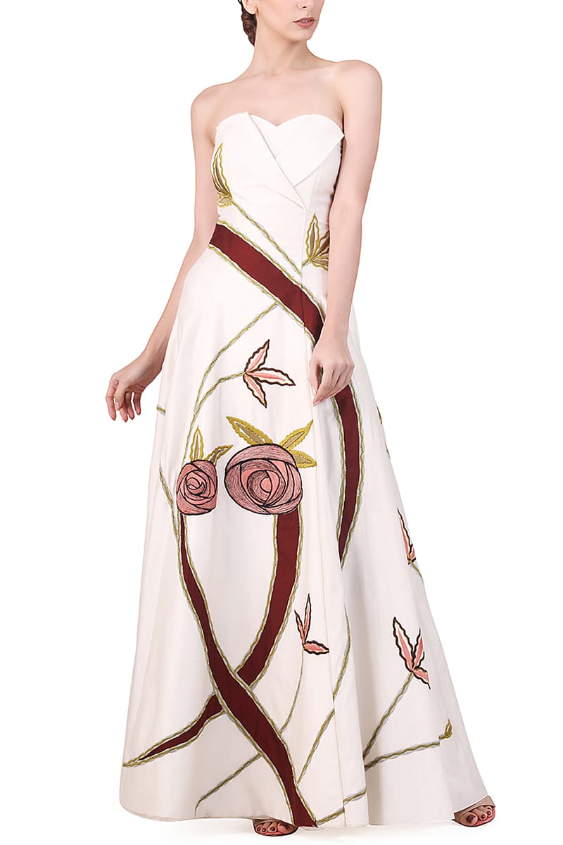 Ivory sweetheart neckline floor-length cotton silk bustier gown highlighted in floral motifs of silk yarn.