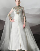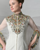 A sculpted column form elevated by intricate neckline embroidery and a sheer trailing layer, creating an airy yet composed presence. Fabric: Cotton Silk & OrganzaEmbroidery: Resham & Zari EmbroideryColour: Porcelain...