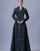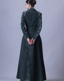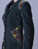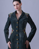 Tailored with a sharp, elongated line, the silhouette is softened by delicate hand-embroidered accents and statement buttons, bringing structure and refinement into quiet harmony.